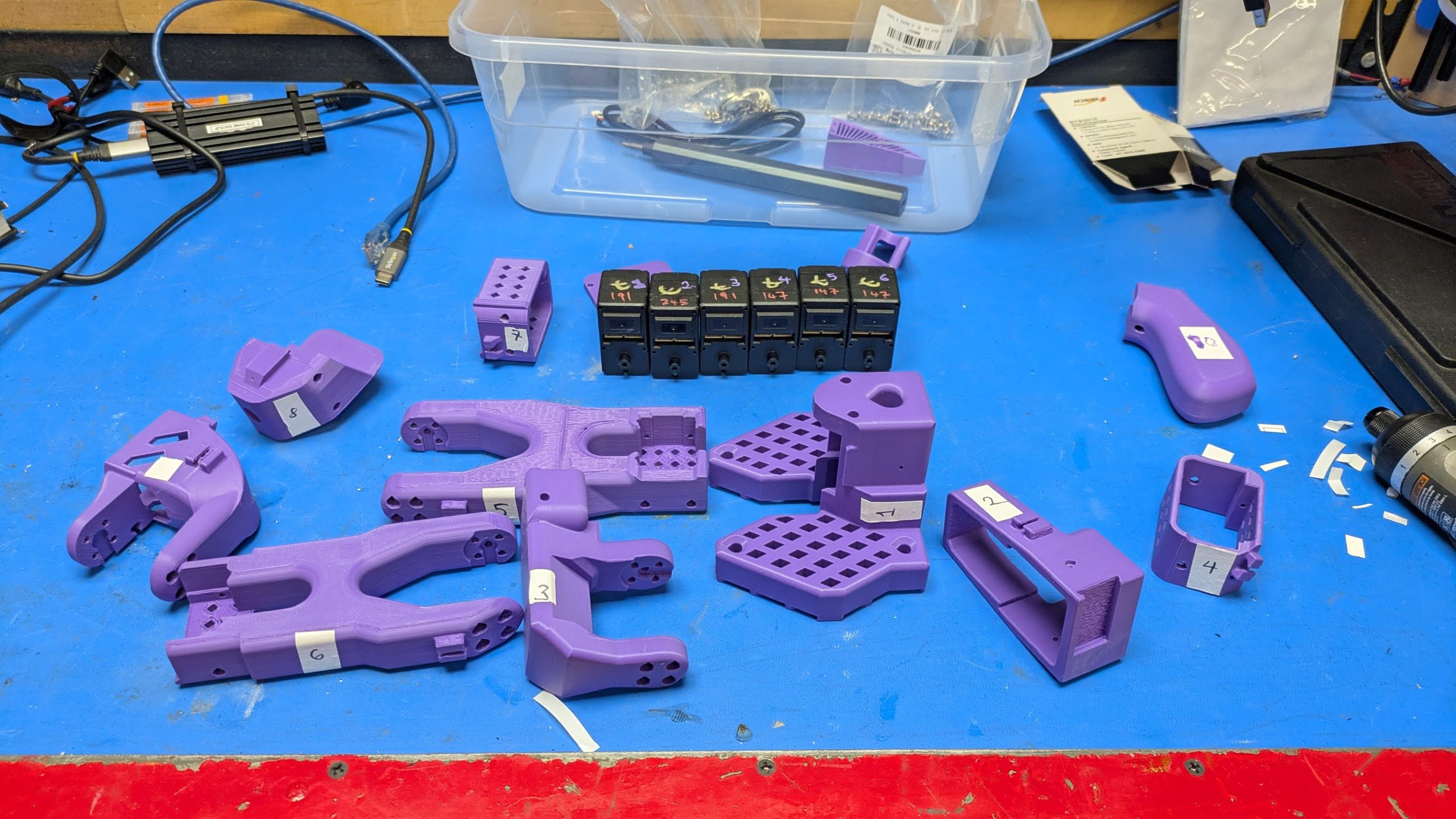 for the so-arm101 i got the “pro” unassembled kit –basically a pile of six 12.4v feetech servos for the follower arm, plus a pile of six 6V feetech servos for the leader arm, some wires, and two motor controllers. i proceeded to print the arms themselves (each print took 12 hours!)