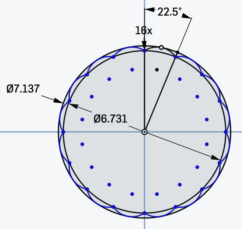 - Outer diameter: 7.137cm; inner diameter (at bottom of arcs): 6.731cm; Circles: 16x of them, so 22.5deg apart.