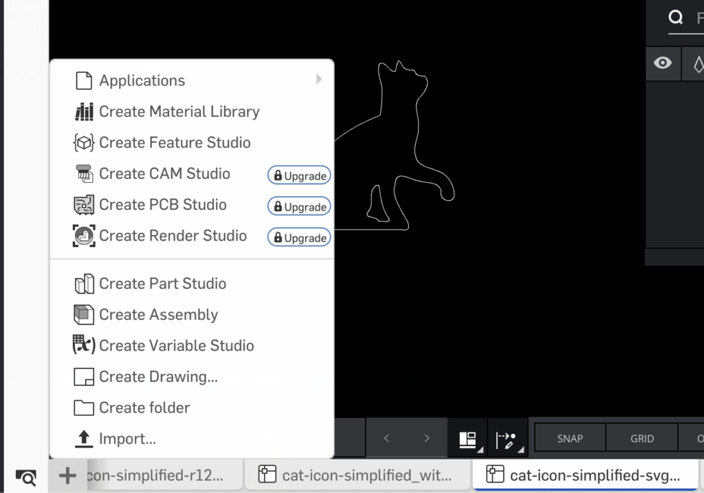 - In Onshape, import the DXF: At the bottom, use the “+” to import an STL. This pops up the file as a 2D-CAD tab inside onshape.