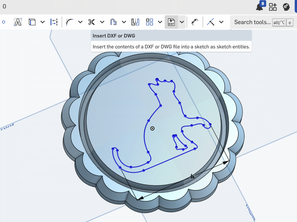 - Go back to the original part. Create a new sketch, then at the top there is a file icon that says “DXF” and select the dxf we just imported from the dropdown.