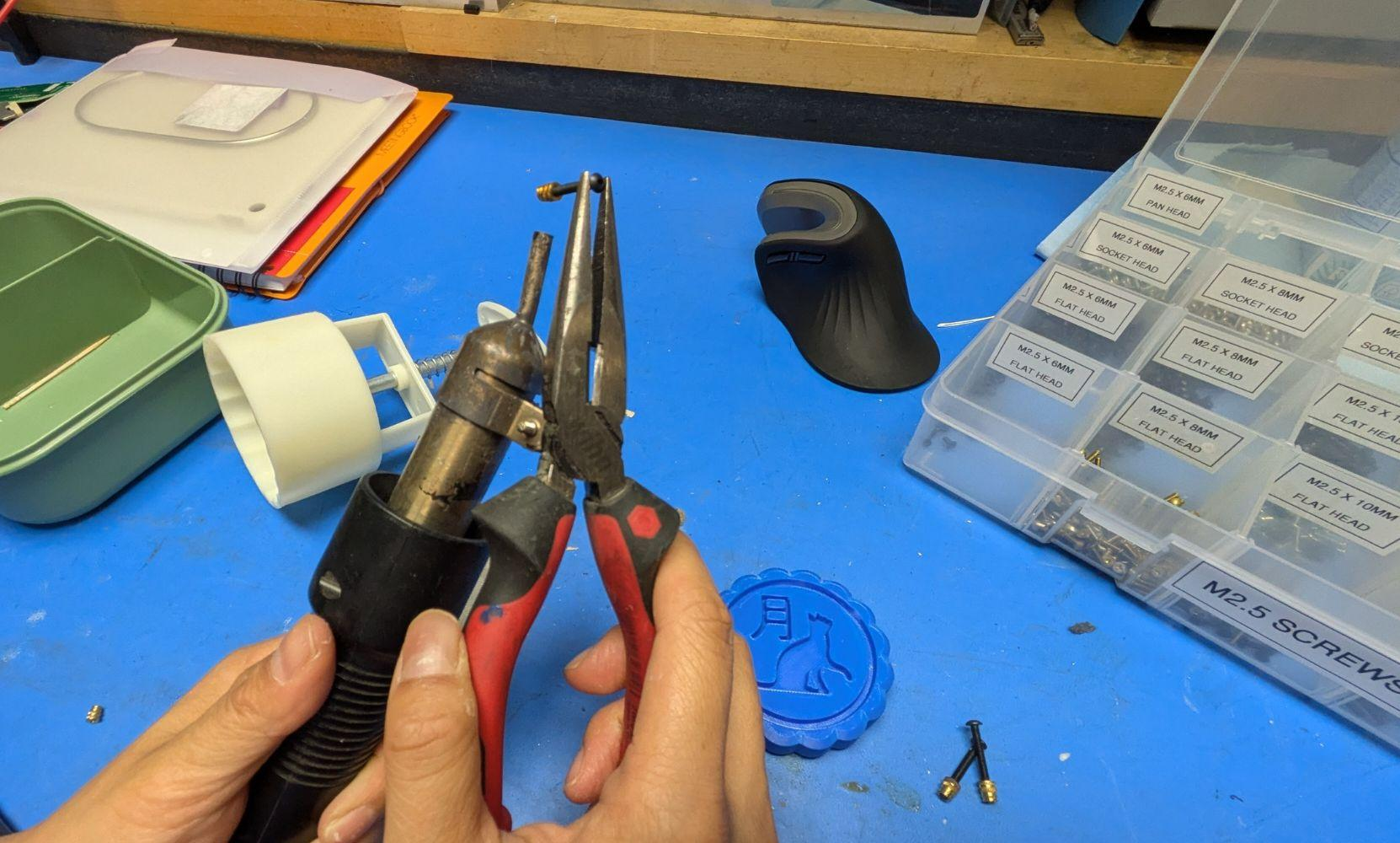 Dane showed me this method of using a heat gun to heat up the whole insert — with a bolt acting as a handle for pliers to hold the insert — and this way when you push it in no plastic ends up inside. Less likely to mess up soldering iron tip with plastic gunk, but also harder to control how straight it goes in because you’re handling the insert from the side instead of pushing down (and takes a bit more patience waiting for the heat to transfer). It looks like this: