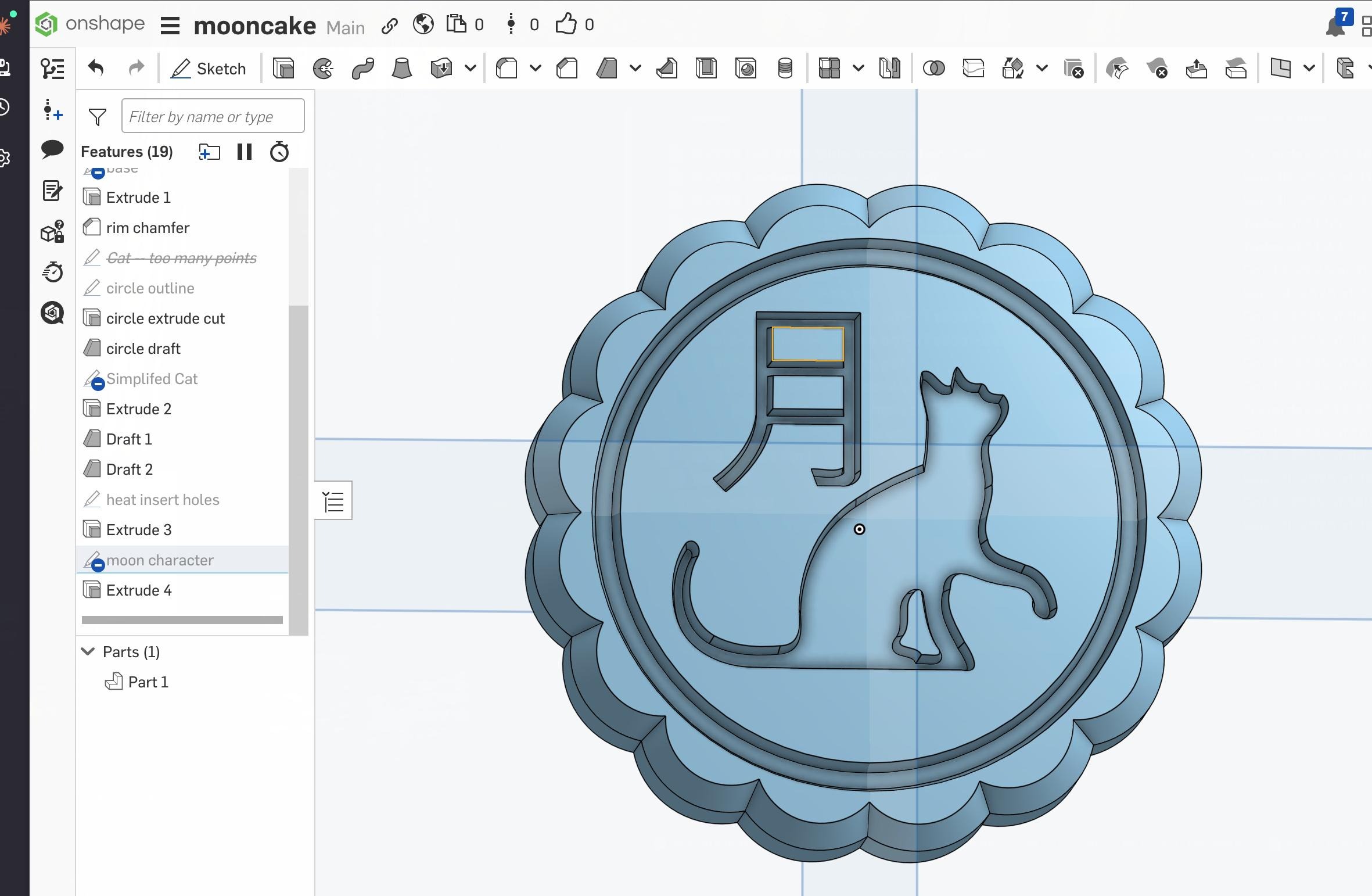 There are these mooncake molds you can get for $10-$15 online. They have swappable design plates. I finally got around to making a custom mooncake mold faceplate. I’m not super happy about the design (it just is a moon cat), but as a proof-of-concept happy I finally finished it.