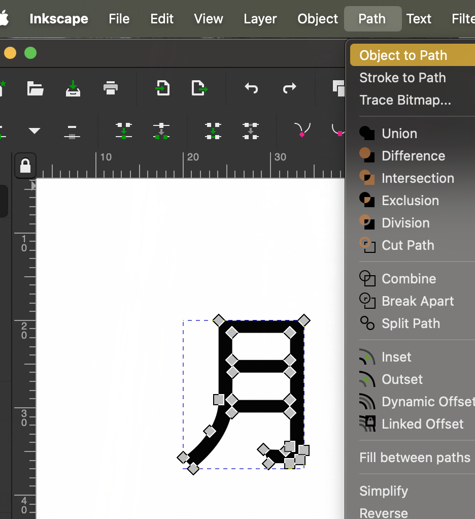 - Alternatively, if you want text to a path, write the text in inkscape, then select “object to path”. Then you can simplify that.