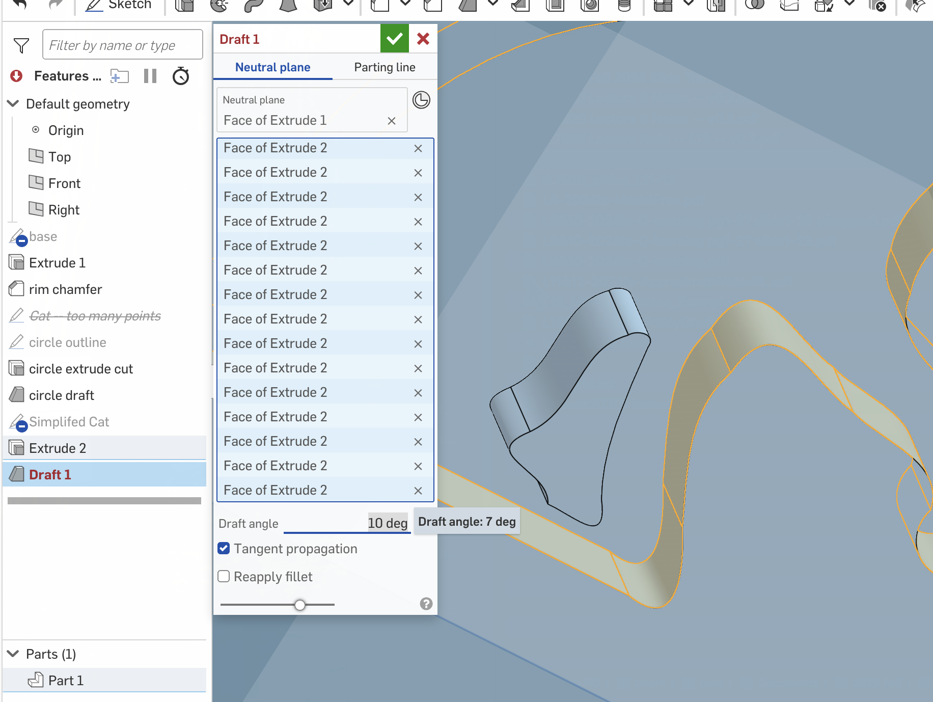 Side Note on the imported DXF (things I tried and do not recommend): All the points will actually not be connected (it’s a bunch of individual lines). You can connect them if desired, by drag-selecting each pair and clicking “coincident” — but doing so didn’t actually let me run a fillet or draft along the entire (cat) outline at once. In the end I gave up and just selected all the faces by hand.