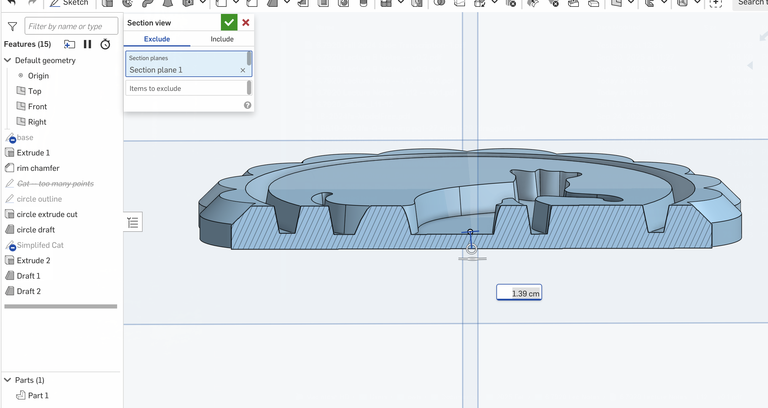 - Add some appropriate looking amount of draft (slope to the sides so the cake comes out more easily). This requires likely selecting all the faces by hand. If there’s errors, try decreasing the draft angle.