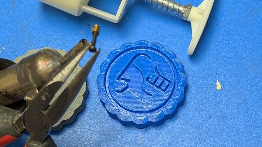 Dane showed me this method of using a heat gun to heat up the whole insert — with a bolt acting as a handle for pliers to hold the insert — and this way when you push it in no plastic ends up inside. Less likely to mess up soldering iron tip with plastic gunk, but also harder to control how straight it goes in because you’re handling the insert from the side instead of pushing down (and takes a bit more patience waiting for the heat to transfer). It looks like this: