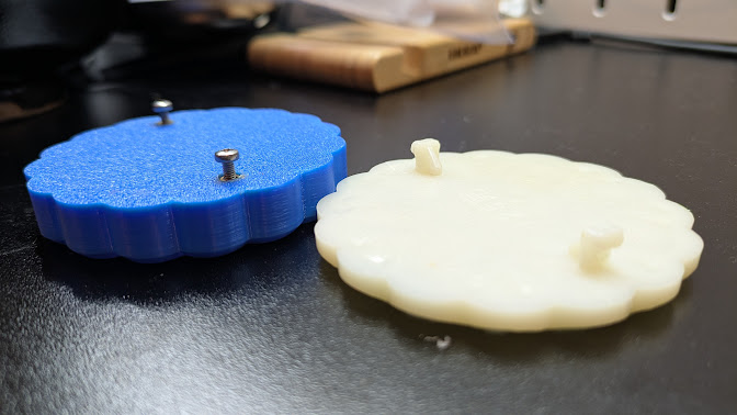 The main other trick is to use heat-set inserts and bolts to take the place of the mold retaining features. Matching the original design would require printing the mold upside down (Design facing down) as otherwise it’d be a big block floating over two small pegs. But this means the cake surface would likely be quite messy since the design is a big overhang at that point. The solution is to use bolts instead.