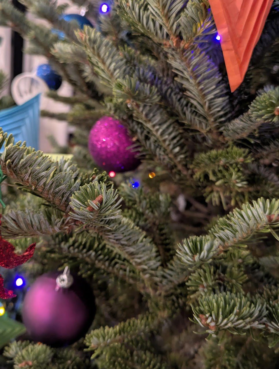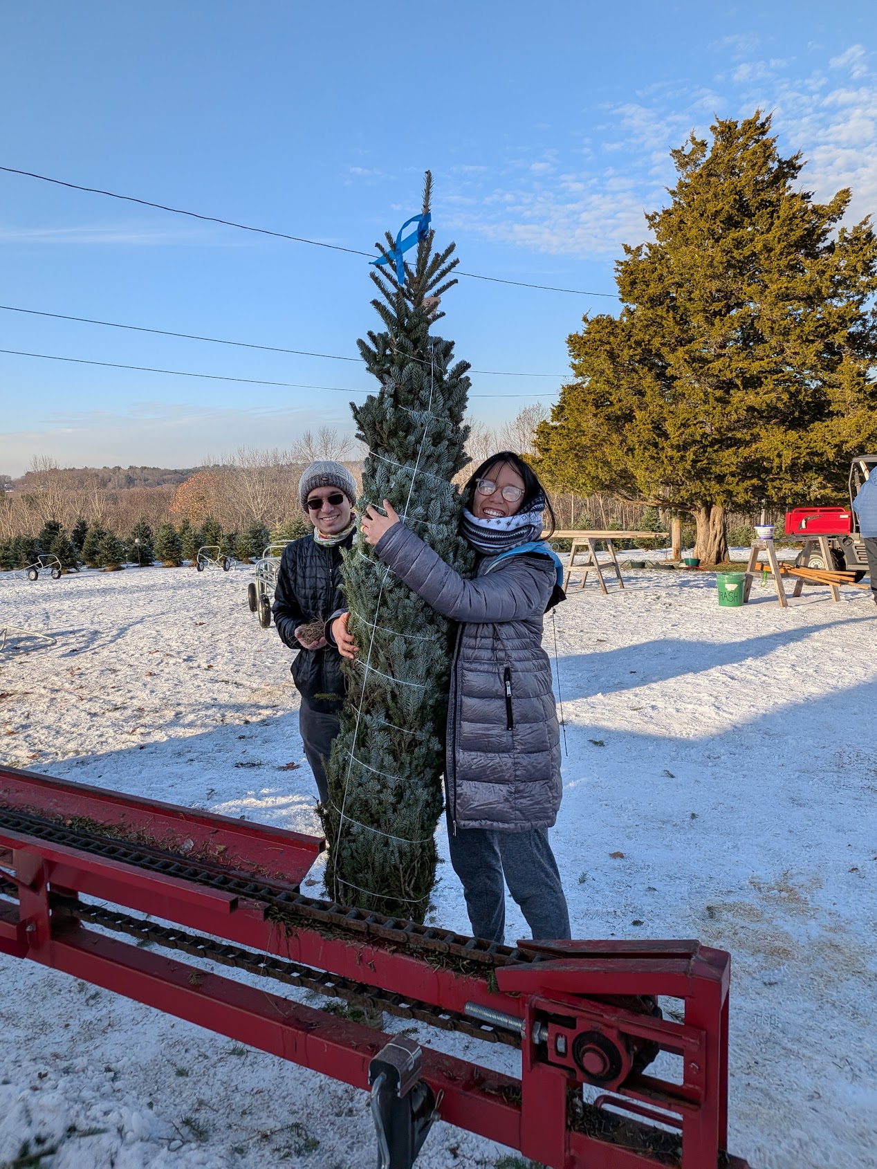 the tree farm has this machine that wraps the tree and it makes it huggable !