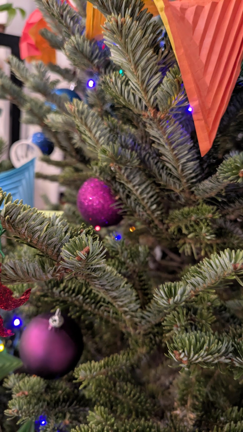 here is the tree, complete with plastic baubles, LED lights, origami decorations, and origami tree topper