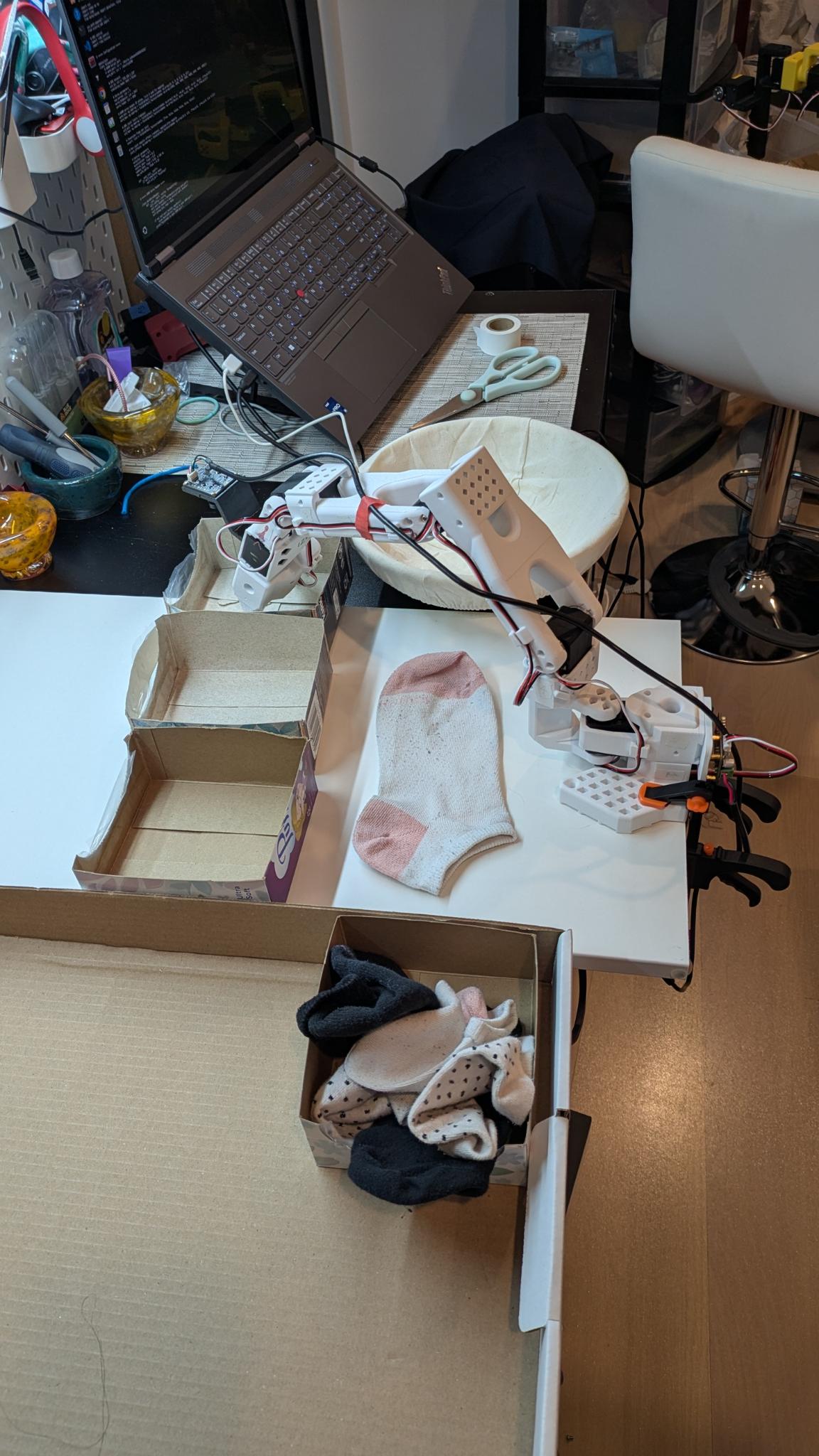 to simplify as much as possible (ideally this is a weekend project or at most a weeklong project to a MVP demo) i decided to start with the so101 arms. they have very limited reach so i cut up some kleenex boxes. if you read up online people talk about radix sort and such, but again, simplify it. i put three pairs of socks (of equal length) that are obviously different designs.